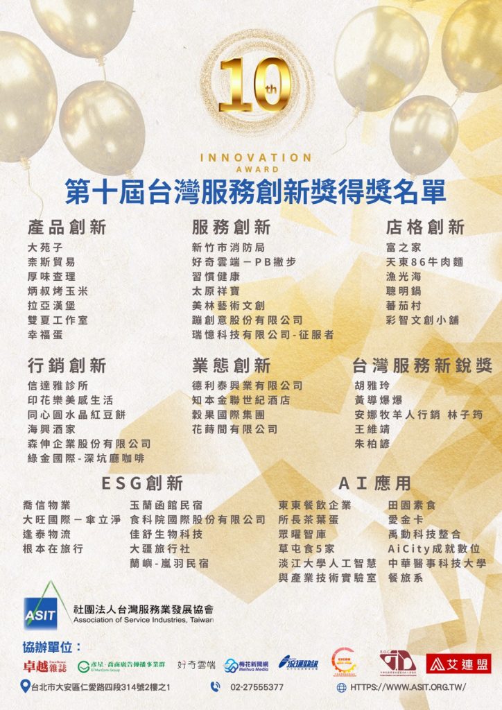 📣 【2025 第十屆台灣服務創新獎】得獎名單揭曉!!📣 感謝大家的耐心等候,本屆台灣服務創新獎結果在評審們的審慎評估下正式出爐‼️ 今年除了「產品創新獎」、「服務創新獎」、「店格創新獎」、「行銷創新獎」和「業態創新獎」外,延續符合時代趨勢的「ESG創新獎」及「AI應用創新獎」,除此之外更特別增能設「台灣服務新銳獎」,鼓勵個人創新精神! 特別感謝所有參與的企業為台灣服務業樹立新標竿,並為產業發展奠定了重要的里程碑!本會將特優之團隊推薦予此獎項,以表彰其卓越貢獻。 🏅️ 恭喜以下得獎品牌🏅️ 相關